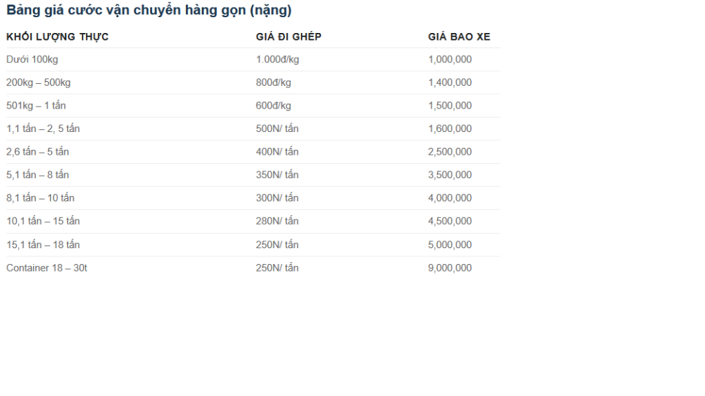 Bảng giá cước vận chuyển hàng gọn (nặng)